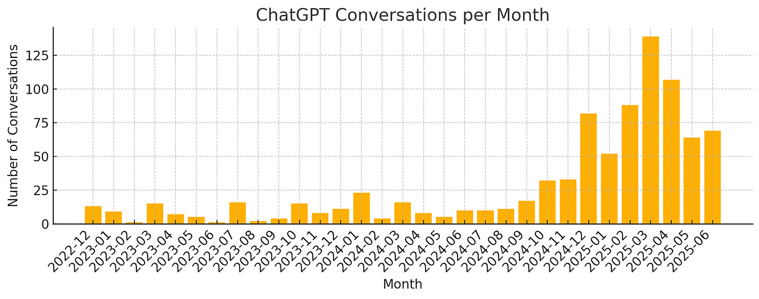 If I was skeptical then, lived experience quickly proved me wrong and her an early adopter. In the months that followed, my own usage of ChatGPT skyrocketed to heights I would never have imagined possible: